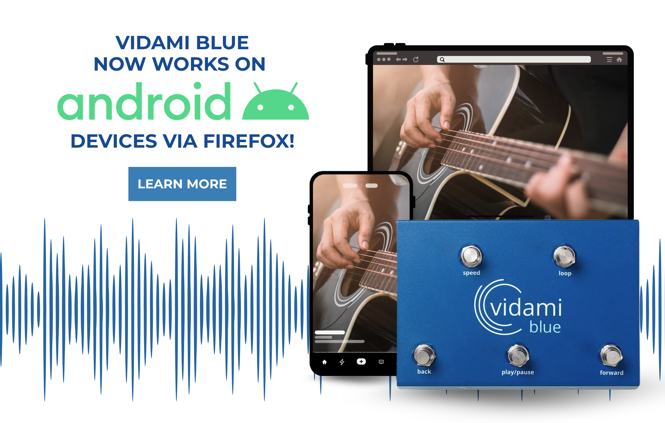Two big things: Vidami now works on Android via the Firefox Add-On, and Firefox is now supported on Mac and Windows. Install the Add-On, pair your Vidami Blue or Original Vidami pedal, and you’re set.